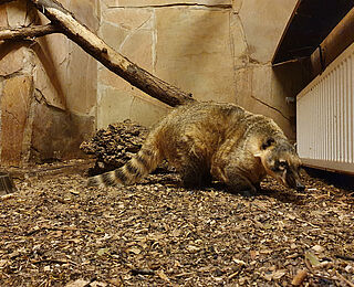 Weißrüssel-Nasenbären leben sowohl auf den Bäumen als auch am Boden. Wenn sie sich am Boden fortbewegen, halten sie den Schwanz senkrecht nach oben,...